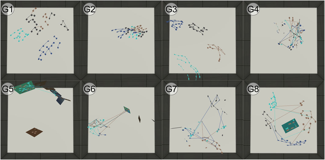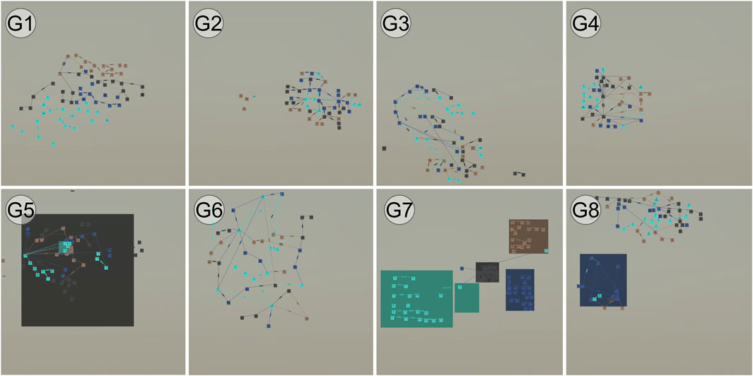 D4. (Organisation) Support easy placement and arrangement: some participants in VR did not arrange the notes as significantly as on desktop (see Figures 1b,c), so they ended up with a “messy spiderweb-like” mind map (see Figures 1f,g).