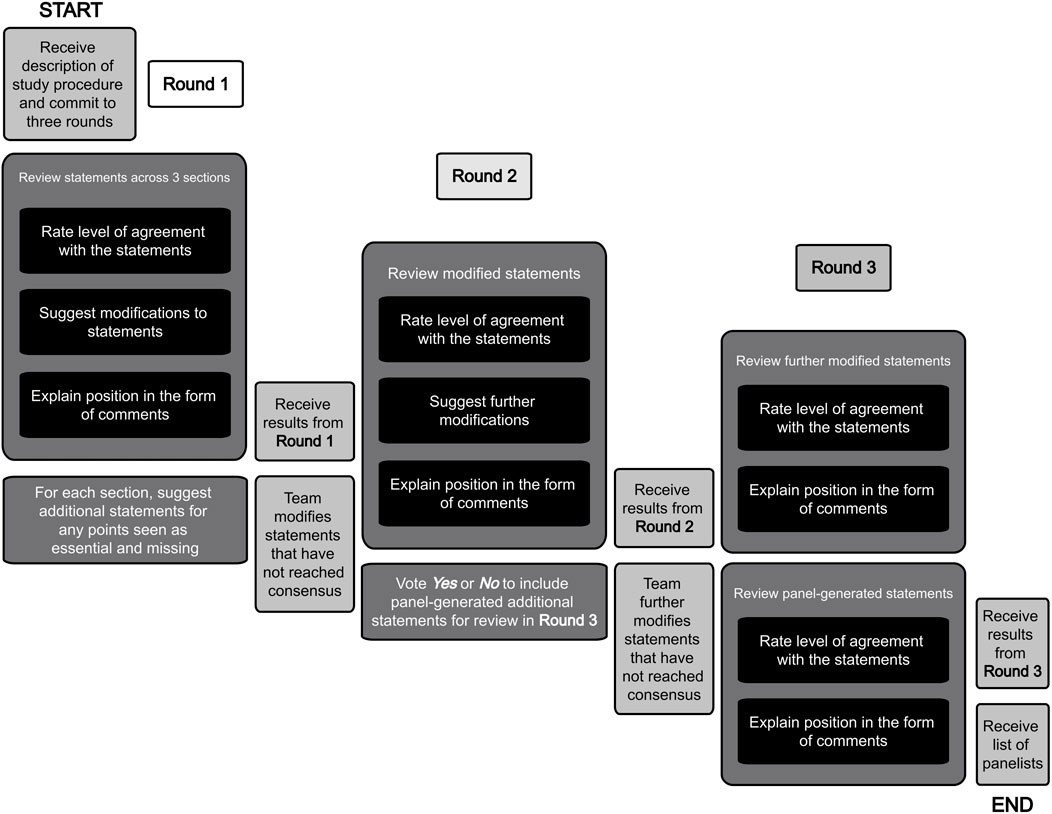 An a priori decision was made to carry out the study in three rounds to allow panelists the ability to suggest additional statements that could then be considered by the other panelists. At the end of Round 1, participants were invited to provide additional statements that they felt were essential and missing. Additional statements that were suggested by panelists in Round 1 were voted on for inclusion in Round 2: any statement generated in Round 1 that simple majority agreed in Round 2 should be included was then presented in Round 3 for experts to consider. Respondents reviewed all included statements according to a four-point Likert-rating scale (Strongly Disagree, Disagree, Agree, Strongly Agree) with a fifth point available for those who neither agreed nor disagreed (Other - comment on next page). This scale was selected to avoid the ambiguity of a Likert midpoint that might force respondents to indicate either neutrality or uncertainty.