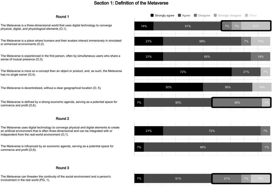 Figure 2. Definitions of the metaverse. Legend body: This figure visualizes panelists’ levels of consensus on statements on definitions of the Metaverse across each of the three rounds. Instances of stronger agreement are visualized in black; agreement in dark grey; disagreement in medium grey; strong disagreement in light grey; and “other” in the lightest grey. Lack of consensus is framed by a bold, round-cornered black rectangle.