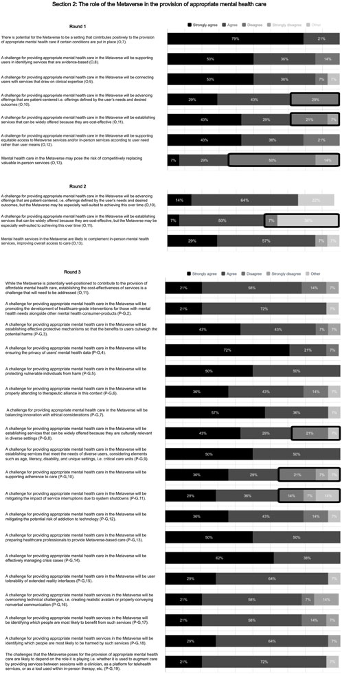 Figure 4. Appropriate care in the Metaverse. Legend body: This figure visualizes panelists’ levels of consensus on statements on conditions for appropriate mental healthcare in the Metaverse across each of the three rounds. Instances of stronger agreement are visualized in black; agreement in dark grey; disagreement in medium grey; strong disagreement in light grey; and “other” in the lightest grey. Lack of consensus is framed by a bold, round-cornered black rectangle.