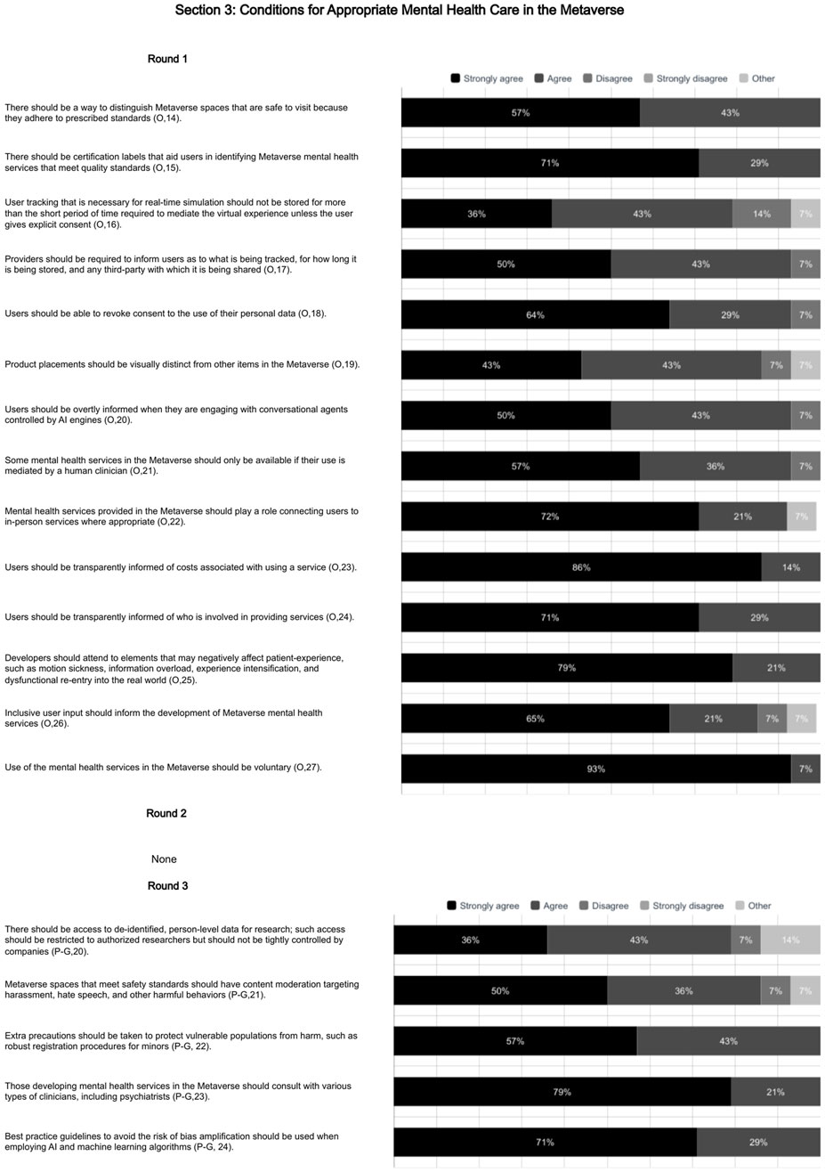 For the statements that did not initially reach consensus, open-ended responses suggested that respondents tended to see opportunity, i.e., that the Metaverse might eventually be well-suited to providing personalized services (n = 4) and potentially able to overcome cost barriers to provide cost-effective services (n = 3). Respondents had the strongest opposition to the idea that the Metaverse may pose the risk of competitively replacing valuable in-person services, with 64% disagreeing or strongly disagreeing. Respondents emphasized that Metaverse services were likely to be complementary to presently available services (n = 5), citing the role the Metaverse may play in increasing access (n = 4) and emphasizing the high, unmet present need for mental health services (n = 4). See Figure 3 to review the evolution of statements in Section II across the three rounds and for the rates of agreement with each statement.