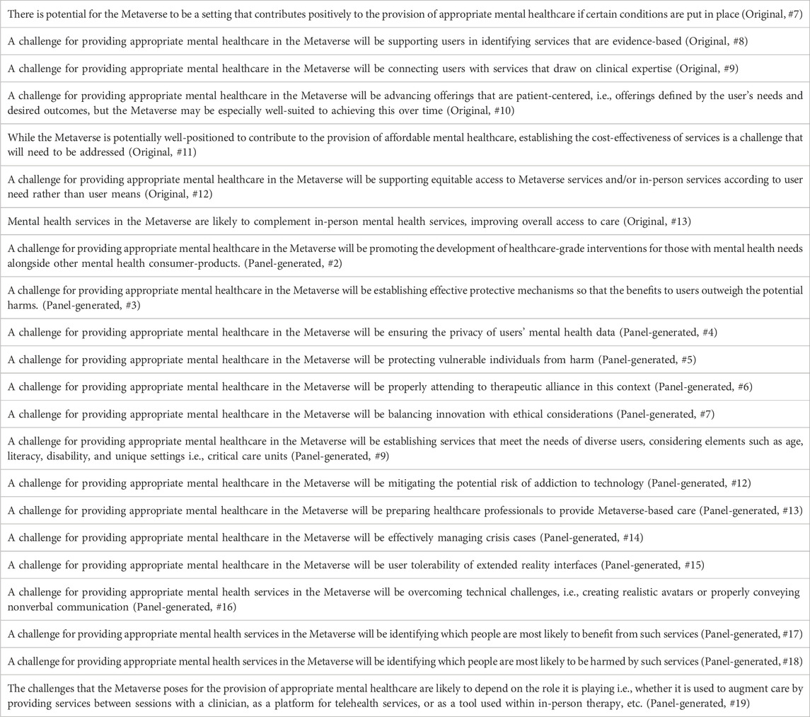 Respondents expressed general optimism about the role of the Metaverse in the provision of appropriate mental health services, with 100% agreeing or strongly agreeing in Round 1 that “There is potential for the Metaverse to be a setting that contributes positively to the provision of appropriate mental health care if certain conditions are put in place.” Respondents emphasized the value of empirical and experimental work done prior to implementation to potentially mitigate areas where they did identify challenges (n = 5). Some comments emphasized that the originally framed challenges, which were associated with the five main tenets of appropriate care, were applicable to health care generally as opposed to issues unique to the Metaverse (n = 5). Panelists suggested 18 additional potential challenges for appropriate care, many of which were identified as Metaverse-specific challenges, such as, “A challenge for providing appropriate mental health care in the Metaverse will be mitigating the potential risk of addiction to technology.” 15 of those suggested statements reached consensus. Three comments rated challenges relative to one another or to healthcare in general. For example, “I don't believe this will be as challenging as the other challenges listed” or “This is a challenge that is true of all mental health care services and not unique to the Metaverse. It may be slightly less challenging within the Metaverse.”