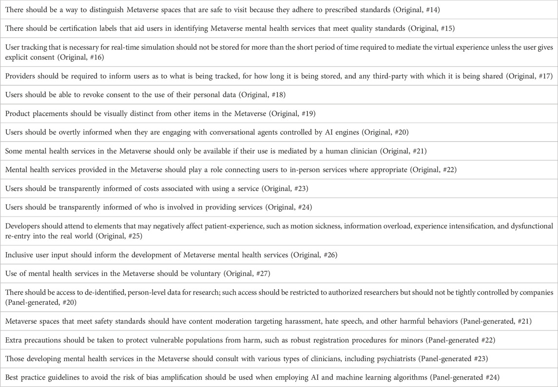 The feedback to researchers tended to be positive, with eight comments across the three rounds offering general support for the value of the study. Three respondents noted that, when taken as a whole, there were redundancies in the final set of statements. Two mentioned the concern that statements were sometimes too general to be useful. Ten of the statements that reached consensus still had one or more comment flagging ambiguity. Three wanted clarification around the term “healthcare-grade interventions” (Panel-generated, #2) and two were unsure about the meaning of “visually distinct” advertisements (Original, #19). Each of the following statements had one comment questioning meaning: “integrated with the real-world” (Original, #1); “short period of time” (Original, #16); “inclusive user input” (Original, #26); voluntary use of Metaverse services (Original, #27); “therapeutic alliance” (Panel-generated, #6); “user-tolerability” (Panel-generated, #15); whether non-verbal communication referred to the therapist or client (Panel-generated, #16); and research access to deidentified, person-level data (Panel-generated, #20).