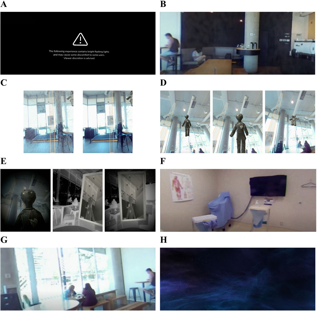 Figure 3. An overview of the VR experience, showcasing various VR scenes and their corresponding visuals. (A) Disclaimer scene. (B) IntroCoffeeShop scene. (C) “Area of Safety”. (D) UpsideDown scene 1. (E) UpsideDown scene 2. (F) ClinicalRoom scene. (G) MiddleCoffeeShop scene. (H) EndingScene.