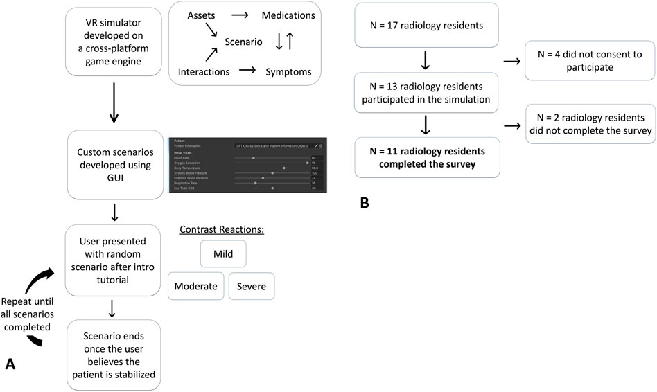 Figure 1. Flowchart describing the VR contrast software platform pathway (A). Participant selection workflow (B).