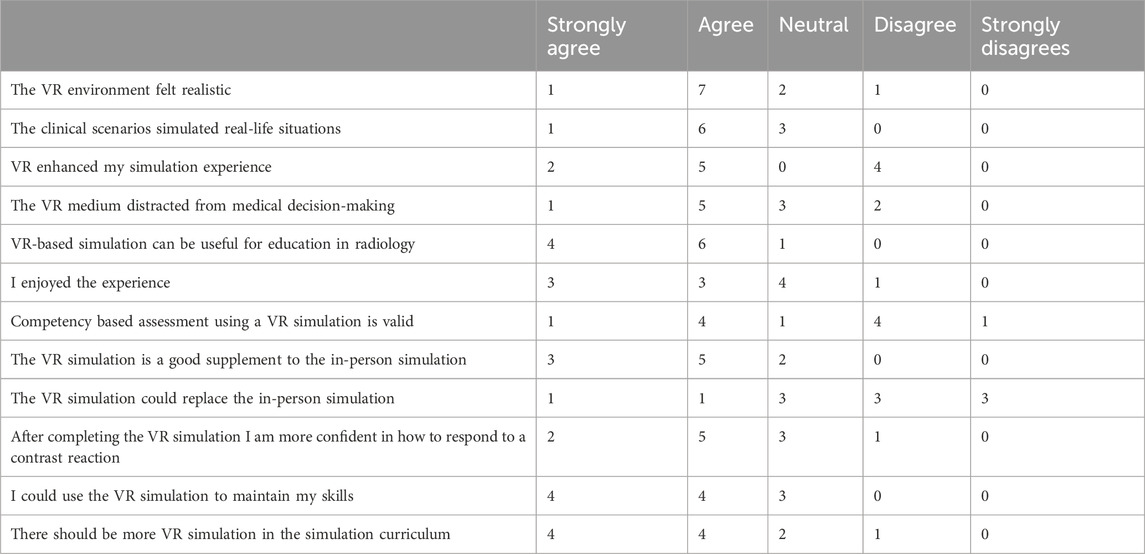 The study was approved by our local institutional review board (IRB) who provided a waiver for written informed consent as no protect health information (PHI) or other identifying information (user name, location) was obtained and the study was deemed minimal risk. In addition, the first question of the survey re-verified that the participant was voluntarily participating in the study and provided the option to withdraw. The survey was administered via an online survey platform (Qualtrics, Silver Lake). Individual questions from the survey were collated into a single survey. In addition to questions scored on a 1-5 Likert scale from Strongly disagree to strongly agree, symptoms were scored from none to severe while usability was scored from not at all to high. First-year radiology residents at a large urban academic institution were targeted for recruitment as they had the least experience with handling contrast reactions. Residents who agreed were given a VR headset and were asked to complete the scenarios at their convenience in the location of their choosing. The residents were instructed before use on how to safely use VR and selecting a space of at least 1 m × 1 m to allow them to walk around within the VR scenario. Participants were also informed to immediately remove the headset if they experienced any ill effects such as vertigo. The scenarios were presented in random order. Immediately following the completion of the VR scenarios, the users were asked to complete an anonymous survey assessing various aspects of the VR simulation experience (Table 1). The survey was designed to include components of previously validated instruments to assess for motion sickness (Kim et al., 2018), realism (Ralston et al., 2021) difficulty (Hart, 2006), accessibility (Khatkar et al., 2022) and the user’s awareness of technology (Venkatesh and Davis, 2000), (Supplemental 1). To maintain anonymity, the VR headsets were placed in kiosk mode allowing usage without a sign in and no data was collected from the VR headset. In addition, no personal information was collected at the time of the survey including any electronic information such as location.