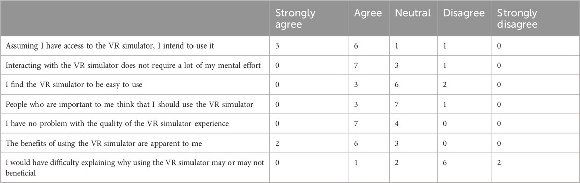 Table 1. Participants views on the VR scenarios for simulation. Note, not all rows add to total participants as participants were allowed to skip questions.