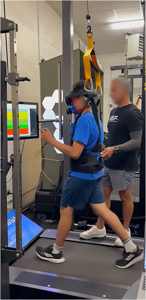 We used the COSMED K5 respirometry system (COSMED, Concord, CA) for all metabolic energetics testing. Before all tests, we instructed participants not to consume any food or drink 2 hours before their scheduled appointment. Prior to treadmill walking, we fitted participants with an appropriate respirometry mask and asked them to sit or lie down (self-selected) in a quiet room for 15–20 minutes to measure resting metabolic rate (RMR). Within the same visit, each subject was required to complete two trials of continuous walking on a Tuff Tread Sports Performance Treadmill (Tuff Tread, Conroe, TX) at a pre-determined velocity (see below), one trial with the VR headset (VR trial) and one trial without (control trial). The trial concluded once the subject reached a steady state of oxygen consumption, which has been shown to occur by 6 minutes of exercise (Chernik et al., 2025). A minimum rest period of 5 minutes was given between each session to ensure the subject returned to baseline metabolic rates. During all trials, participants were monitored by trained occupational therapists. Participants wore a safety harness to mitigate the risk of fall. The treadmill used was wide enough to allow forward, lateral, and backward motion of the arms, without the risk of injury. Figure 1 depicts the experimental setup during VR trials. Throughout the protocol, participants were screened for any balance or sensory disturbances due to the respirometry system or the VR headset.