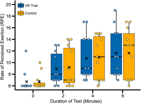 Figure 3. Box plots showing the Rating of Perceived Exertion. Participants were prompted to evaluate their exertion levels at: 0 (before starting trial), 2, 4, and 6 (immediately after trial conclusion). Values are separated by trial type, with VR Trial representing trials where the participant is playing the VR game while walking, and Control representing trials where the participant is not wearing the VR headset while walking. The black “X” denotes the mean.