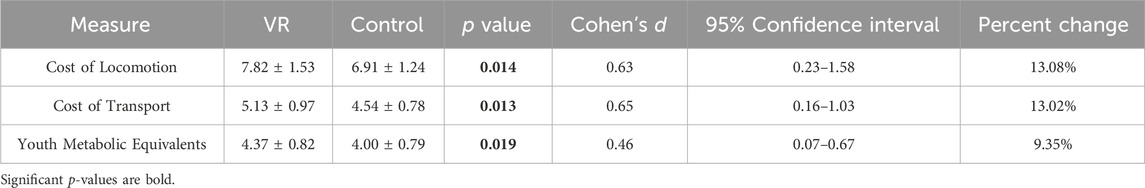 Table 2. Paired t-test analysis analyzing the differences in energy expenditure in the VR and non-VR trials: Cost of locomotion (J·s-1·kg-1), Cost of Transport (J·kg-1·m-1), and Youth Metabolic Equivalents. VR denotes treadmill walking while using the VR headset. Control denotes treadmill walking without using the VR headset. Percent change represents the change in energy expenditure between the control and VR trials, with an increase representing more costly exercise in the VR trials.
