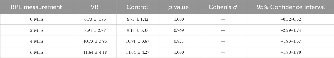 In the control walking trials, participants began the trial at a rating of “no intensity at all” (Borg RPE = 6.73 ± 1.42; Table 3) and concluded the trial at rating of “light intensity” (Borg RPE = 11.64 ± 4.27; Table 3). Similar ratings were seen in the VR trial; participants began the trial at a rating of “no intensity at all” (Borg RPE = 6.73 ± 1.85; Table 3) and concluded the trial at a rating of “light intensity” (Borg RPE = 11.64 ± 4.18; Table 3) (Williams, 2017). Examining the changes in RPE at 0, 2, 4, and 6 min, no statistically significant differences were seen between the VR trials and the non-VR trials (all p-values >0.768; Table 3; Figure 3).