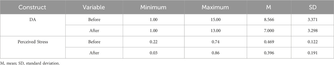 Before the intervention, the mean DA score was 8.57 (range: 1–15), with a standard deviation of 3.371. After the intervention, the mean DA score was 7.00 (range: 1–13), with a standard deviation of 3.298. While the overall trend indicates a reduction, 16 participants (26.7%) experienced an increase in DA following the intervention (Table 1).
