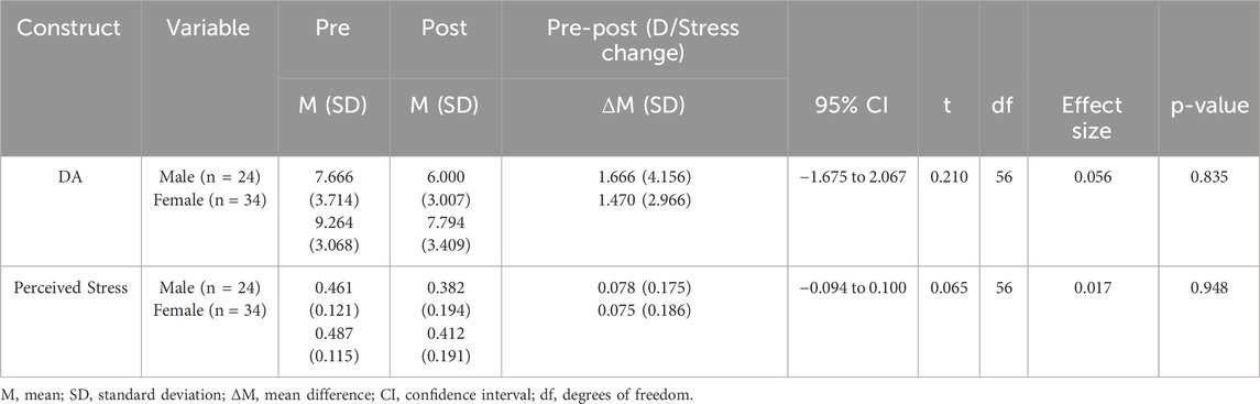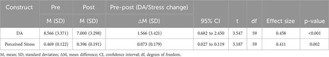 A paired-sample t-test showed a significant reduction in DA (Δmean = 1.566, SD = 3.421, p < 0.001) after the intervention. The effect size (Cohen’s d = 0.458) suggests a small-to-moderate impact (Table 2).