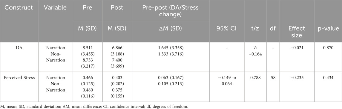 A Mann-Whitney U test found no significant difference in DA reduction between the narration and non-narration versions (p = 0.870). The narrated version showed a slightly greater mean reduction (1.645) than the non-narrated version (1.333). The Z-score (−0.164) and effect size (r = −0.021, rank-biserial correlation) suggest that any observed differences were negligible and likely due to random variation (Table 3).