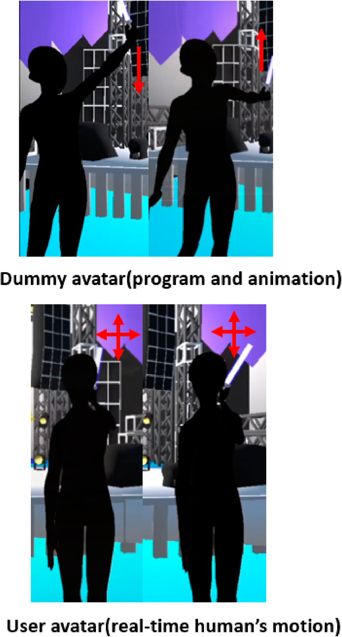 Figure 1. Comparison of dummy avatars and user-controlled (human-driven) avatars. Dummy avatars perform pre-programmed motions, while user-controlled (human-driven) avatars reflect real-time human movements, enabling enhanced emotional expressiveness and interaction.