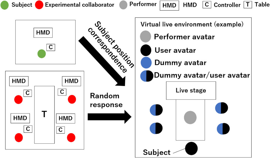 Figure 2. A diagram showing an experimental environment. This includes the spatial arrangement of avatars, differentiating between user-controlled avatars and dummy avatars performing pre-programmed motions. The layout clarifies the positions of each avatar type during the VL event.