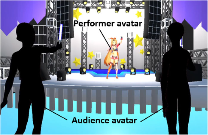 As illustrated in Figure 3, the stimuli used in this study included a performer avatar and audience avatars with uniform motions. This figure, originally placed in the Introduction, is moved here to clarify that it represents the experimental setup specific to our study. As illustrated in Figure 4, the immersive virtual live venue includes a stage-front perspective and audience area context, providing participants with a realistic concert environment.