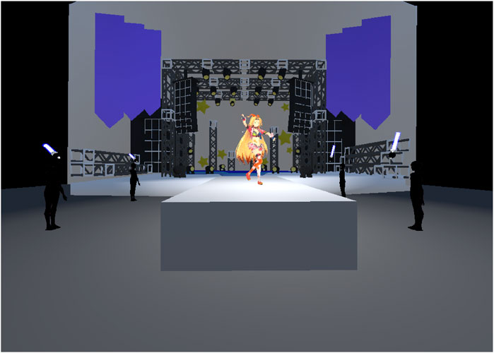 During the experiment, the song package ‘Unity-chan Live Stage! -Candy Rock Star-(version 1.0)’ (UNITY-CHAN!OFFICIAL-WEBSITE, 2014) was used. The performer avatar, Unity-chan, provided consistent musical and motion stimuli, while the focus was on analyzing how real-time synchronized and diverse audience avatar gestures contribute to an enhanced sense of presence beyond the performer’s actions. The experiment varied the ratio of actual users (user-controlled (human-driven) avatars) and program-controlled avatars (dummy avatars) across three conditions (0%, 50%, 100% user-controlled (human-driven) avatars), with participants controlling avatars via Oculus Quest 2 HMDs.