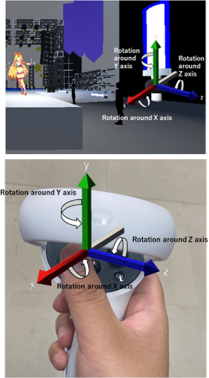 As depicted in Figure 5, the participants can control the user-controlled (human-driven) avatars by moving the motion controller as if they were holding a glow stick. The glow stick movements correspond to those of the Oculus Quest 2 VR controllers, with the black circular part serving as a grip handle.