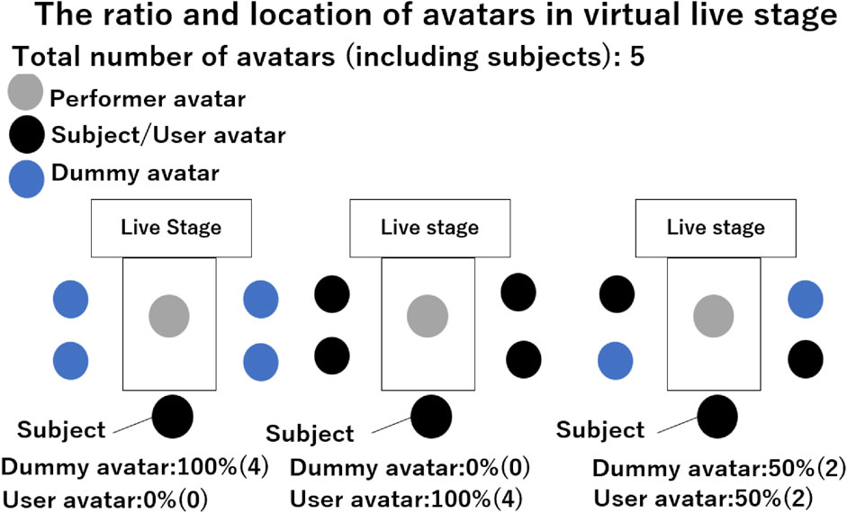 Figure 6. The ratio and spatial arrangement of avatars in the experimental virtual live stage. This layout features one performer avatar and audience avatars (both user-controlled and dummy), highlighting their positions under different experimental conditions (0%, 50%, 100% user-controlled (human-driven) avatars) to evaluate their impact on presence.