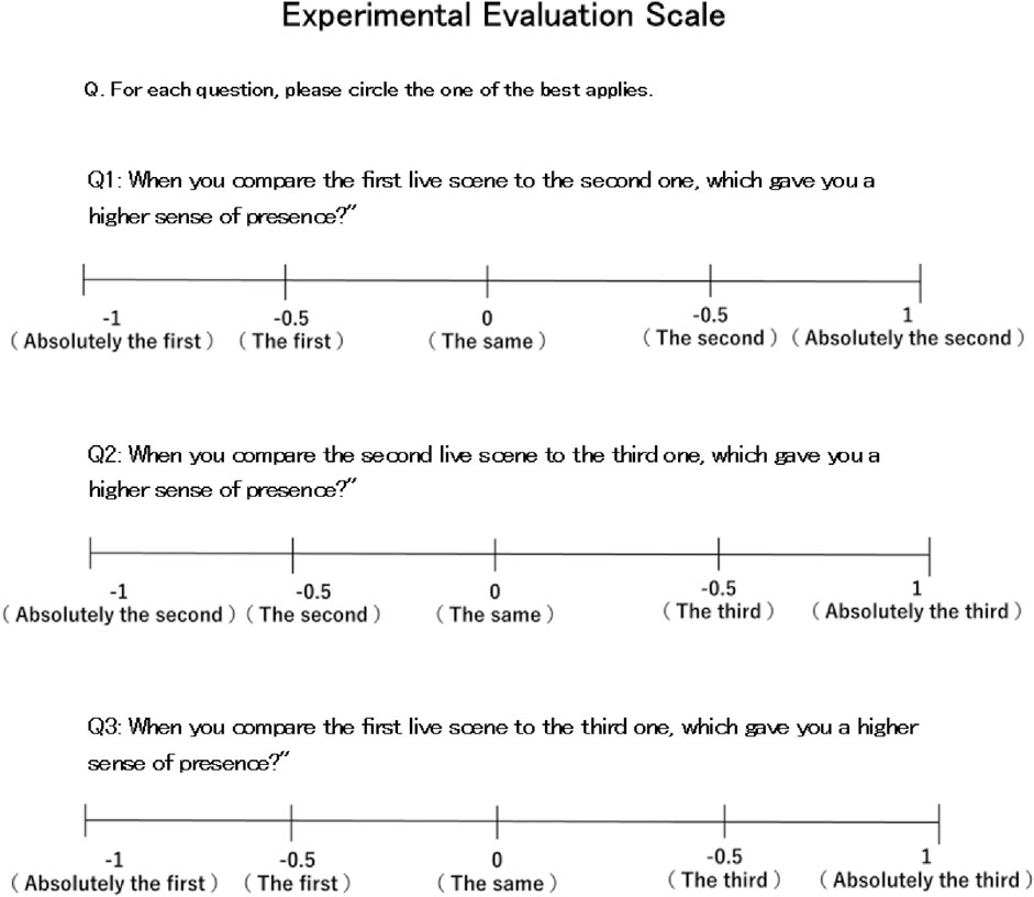 Figure 7. The experimental evaluation scale used to measure the sense of presence in different VL event scenarios. The scale employs Scheffe’s paired comparison method, asking participants to compare two scenes and rate which one provides a higher sense of presence on a five-point scale.