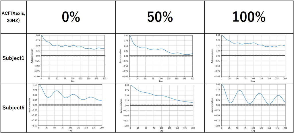 For the motion analysis, motion data from the avatars’ glow sticks were analyzed using autocorrelation (ACF) (Usoh et al., 2000; Brockwell and Davis, 1991) and cross-correlation functions (CCF) (Usoh et al., 2000; Schubert et al., 2001a) to quantify synchronization with the music and among avatars. Peaks in the ACF and variations in the CCF provided metrics for determining whether participants’ movements were periodic and synchronized with the music’s rhythm. A decrease in correlation coefficients with increasing proportions of user-controlled (human-driven) avatars was also investigated (Vivanco and Jayasumana, 2007).