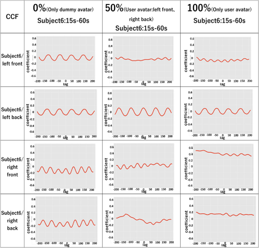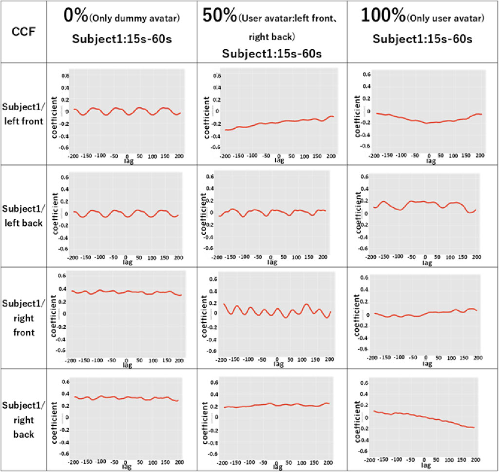 Figure 10. Cross-correlation functions of x-axis rotational data for participant 1, showing synchronization with the “left front” and “right front” avatars. Labels now explicitly indicate whether each avatar was human-controlled or dummy. The interval from 15 to 60 s was analyzed to exclude the initial adaptation period and final fade-out, focusing on the segment of stable rhythm and engagement.
