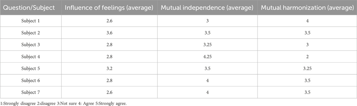 In this pilot study, we report presence and unity as the primary subjective outcomes. Exploratory subscales (emotional susceptibility, independence, interdependence) were inspected qualitatively and showed the same directional pattern, but they are not used for hypothesis testing given the small sample size. The average emotional susceptibility scores ranged from 2.5 to 3.6 (Table 1), while independence and interdependence scores showed expected variations among individuals. Internal consistency was satisfied (Cronbach’s