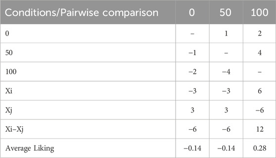 Figure 8. Evaluation results using Scheffe’s paired comparison method (Scheffé, 1952) for differences in the sense of presence.