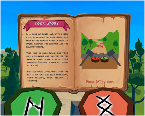 Introduction: Storytelling is widely recognized as an effective tool for increasing engagement and motivation in digital games and learning environments. However, its application and impact in virtual reality (VR) is still under-researched due to the relative novelty of VR technology. In this study we explore the integration of storytelling elements into the game Steady the Drums! and examine their impact on user experience, performance and overall game appeal.