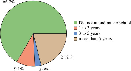 Two-thirds of the participants had not attended a music school. Among those who had, the duration of attendance varied from a few years to over a decade (see Figure 4). Thirteen participants played one or more instruments, with piano being the most common, followed by guitar, flute, and violin. Twenty participants confirmed involvement in other formal or informal music-related activities, with dancing being the most common (9 participants), followed by singing, playing in a band, and other musical activities. Most of these individuals pursued music through formal training or courses, while some were self-taught. Half of those who were musically active are still actively involved.