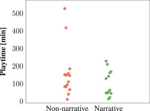 The results indicate that the non-narrative version was played on average 10 min longer than the narrative version. Furthermore, the gender of the participants and the monthly playtime, which was collected at the beginning of the study using a profiling questionnaire, do not appear to significantly influence the time spent playing our game.