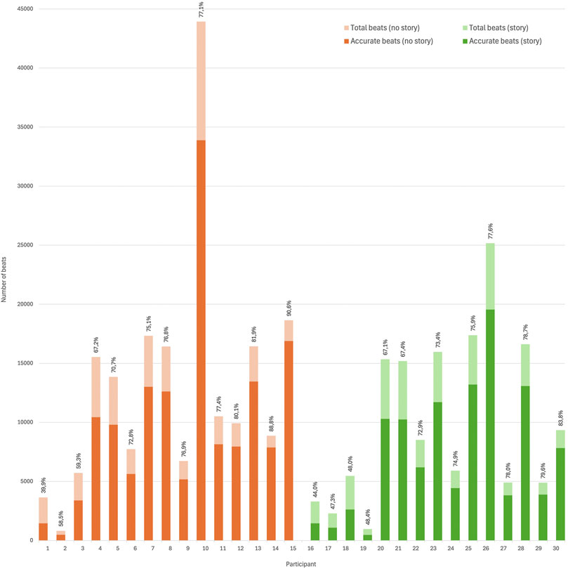 To compare player performance in both versions of the game, we analyzed the percentage of successful drum hits and the frequency of reaching various game levels. Figure 6 shows the percentage of correctly executed drum hits compared to the total hits for the participants of both groups. The darker sections of the bars represent successful hits, while the lighter sections cover the total number of hits per participant. In addition, the percentages of the success rate are indicated at the top of the bars. The average success rate for the non-narrated version was higher (72.9%) than for the narrated version (67.8%). The data reveals that some participants achieved very high success rates in both versions of the game, however the overall performance was slightly better in the non-narrative version, possibly indicating easier cognitive processing (due to the lack of story interruptions) or higher motivation and concentration of players in this group.