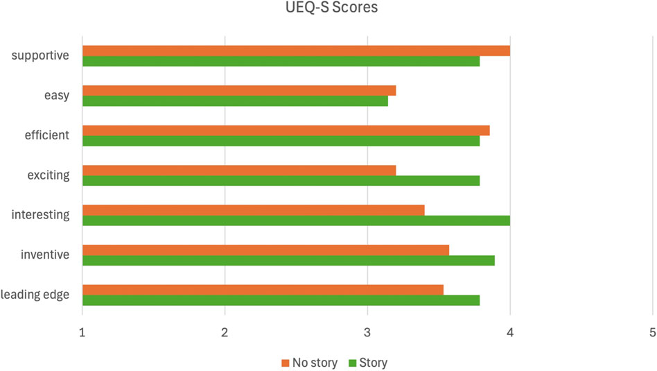 In Figure 7, participants rated both versions of the game consistently on attributes such as being supportive, easy, and efficient, with the version without storytelling element slightly outperforming the version with the story. On the other hand, the storytelling version received higher average ratings for being exciting, interesting, inventive, and leading-edge.