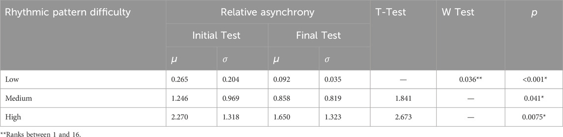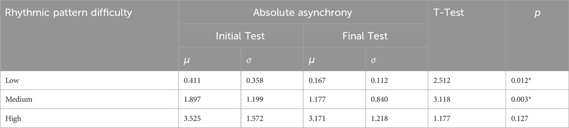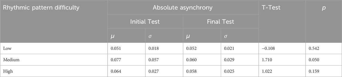 Large improvements were observed in rhythmic synchronization, particularly in relative asynchrony. Absolute asynchrony (Table 1), which measures the accuracy of taps compared to ideal time intervals, showed an improvement in easier and moderately difficult rhythmic patterns (p = 0.012 and p = 0.003, respectively). These results suggest that participants became more adept at synchronizing with the rhythm in less complex patterns, while they struggled to make similar progress on more challenging rhythms.
