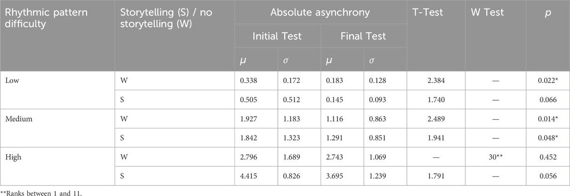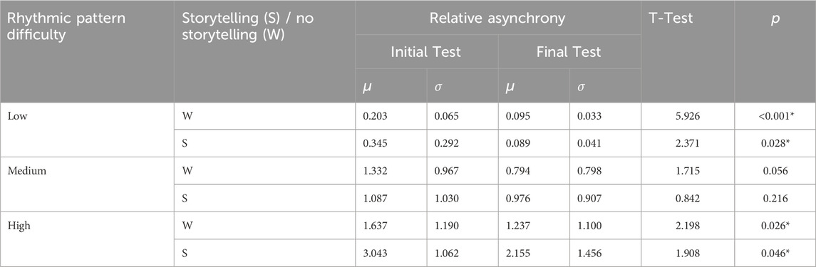 Both groups showed improvements in rhythmic synchronization, but the group playing the no-storytelling version of the game showed greater overall progress. In terms of absolute asynchrony Table 4, the no-storytelling group showed highest improvements in the easier and moderately difficult rhythmic patterns (p = 0.022 and p = 0.014, respectively), with a smaller, but non-significant reduction in the most difficult pattern. In contrast, the group playing the storytelling game version only showed a visible improvement in the moderately difficult rhythms (p = 0.048), with less pronounced changes in the easier and most difficult patterns.