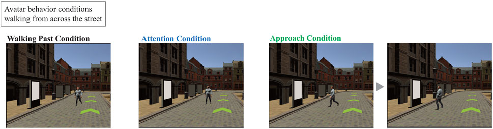 Methods: We conducted an experiment where an avatar walked behind another avatar passing in front of public display on a virtual sidewalk. The avatar’s behavior was set to three conditions: Walking past, Attention, and Approach to the public display.