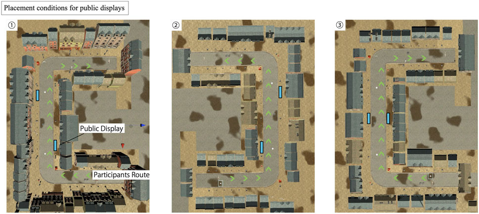 Participants began with a practice session in the VR environment, learning how to move around and confirm the route to be followed. The practice used a simple street environment and lasted about 3 min, with green arrows indicating the path. Two public displays were also placed in this practice environment. After the practice, participants performed three main trials, with a short break between each trial to reduce VR motion sickness. All three conditions—Walking Past, Attention, and Approach—were experienced, but display placement patterns and the order in which participants encountered each condition were randomized.