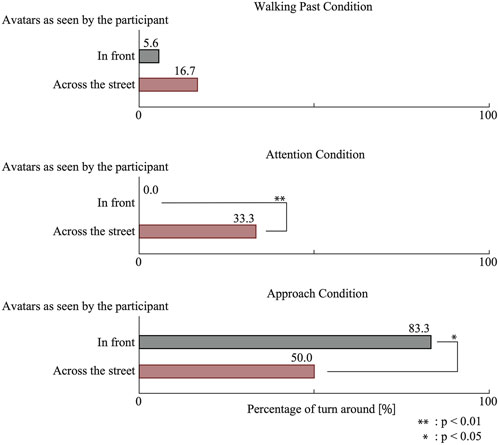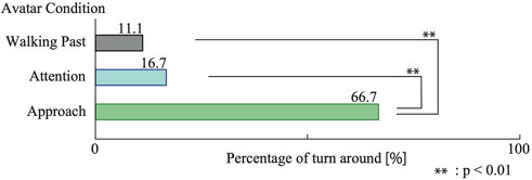 First, based on the recorded video data, we defined head-turning as follows: when the avatar walking ahead turned toward the display or approached it, any subsequent head turn by the participant toward the display was considered a “head-turning event.” In the Walking Past condition, by contrast, we simply noted whether the participant looked at the display. These events were identified by experimenters reviewing the video footage and determining whether the participant’s viewpoint clearly shifted toward the signage. While we did not perform frame-by-frame quantitative angle analysis or discrimination based on fixation duration, this operational definition allowed us to consistently distinguish intentional orienting responses from small posture adjustments. There were 18 participants and two displays, so the data count in each of the Walking Past, Attention, and Approach conditions was