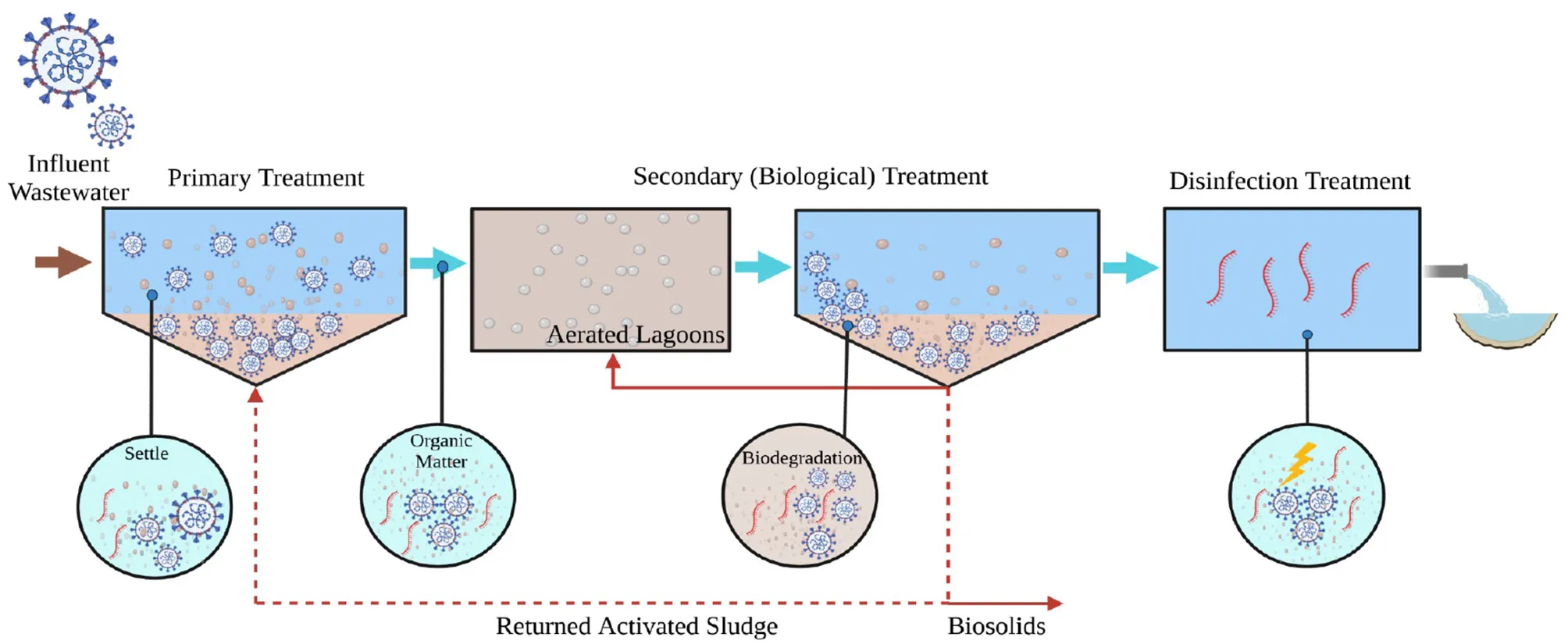Wastewater treatment personnel may come in contact with wastewater media (liquids, solids, aerosols) during sampling or system maintenance; therefore, there was early concern of SARS-CoV-2 exposure to personnel at treatment facilities (Ghernaout and Elboughdiri, 2020; Oliver et al., 2020; Shutler et al., 2020). However, several studies have shown the risk of COVID-19 transmission during wastewater treatment to be limited (Arora et al., 2020; Kitajima et al., 2020). Nevertheless, only a few studies have assessed the fate of SARS-CoV-2 in wastewater systems including their discharge to freshwater bodies (Kumar et al., 2021; Mohan et al., 2021; Westhaus et al., 2021; Wurtzer et al., 2021). Bivins et al., (Bivins et al., 2020) documented 90% reduction of SARS-CoV-2 viability after only 1.5 days in wastewater, which is longer than the travel time in a sewage gathering network, and considerably shorter than the typical hydraulic residence time during treatment (Xing et al., 2021). Recent studies have shown that SARS-CoV-2 genetic material was detected in hospital wastewater (Gonçalves et al., 2021; Pourakbar et al., 2021), WWTP influent (Sherchan et al., 2020; Hata et al., 2021) and effluent (Nasseri et al., 2021; Westhaus et al., 2021), as well as in water bodies receiving treated wastewater (Naddeo and Liu, 2020). This indicates a potential downstream human and environmental health risk via the fecal-oral and fecal- aerosol infection routes (Lewis, 2020; Gholipour et al., 2021). For instance, Pourakbar and coauthors (Pourakbar et al., 2021) reported the presence of SARS-CoV-2 RNA in aerosols released during aeration within secondary treatment reactors. Altogether, this suggests SARS-CoV-2 may be variably removed at wastewater treatment facilities.