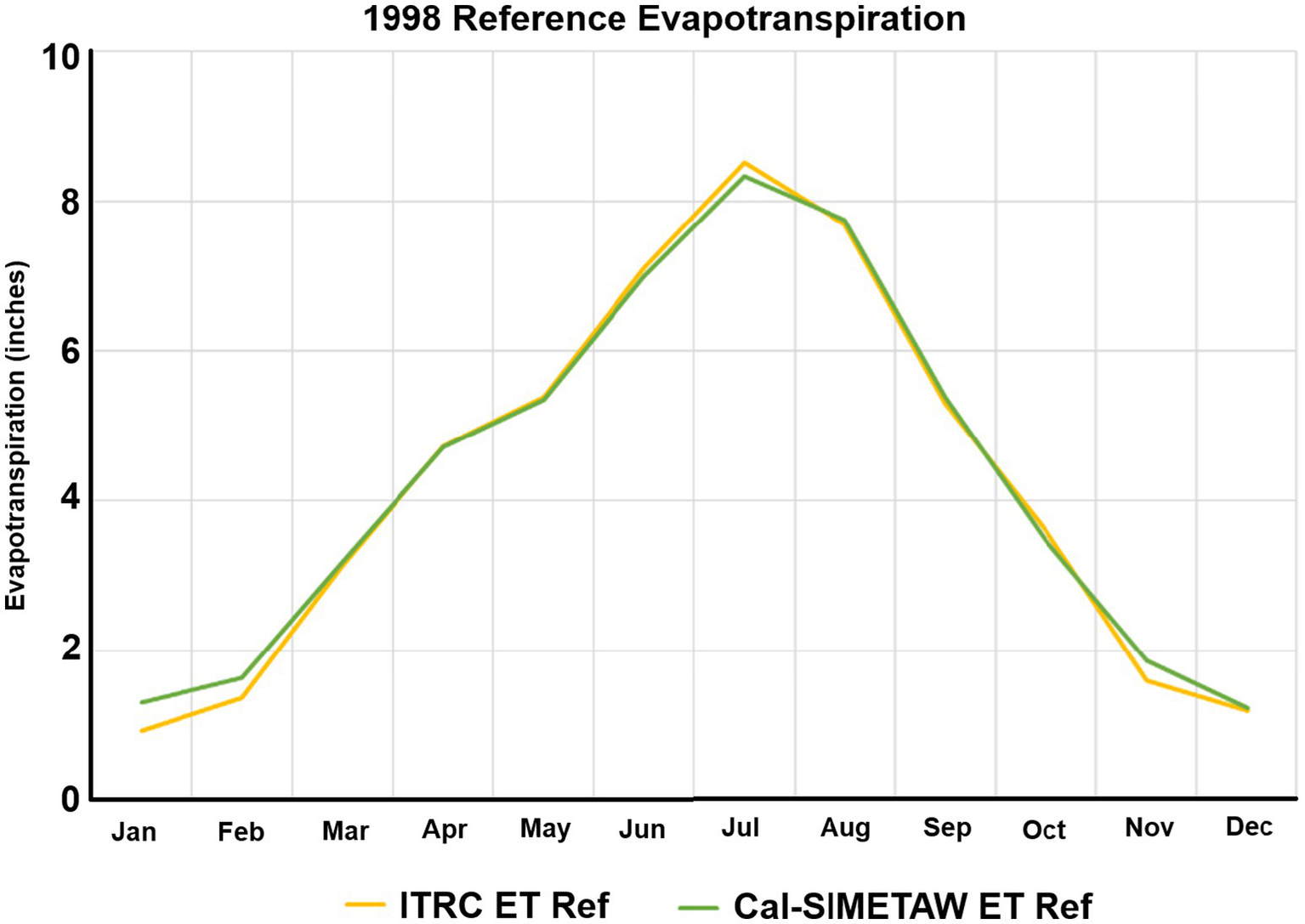 Cal-SIMETAW and ITRC reference evapotranspiration in inches per month (one inch per month equal to 25.4 mm per month) for the 1998 year (wet year).