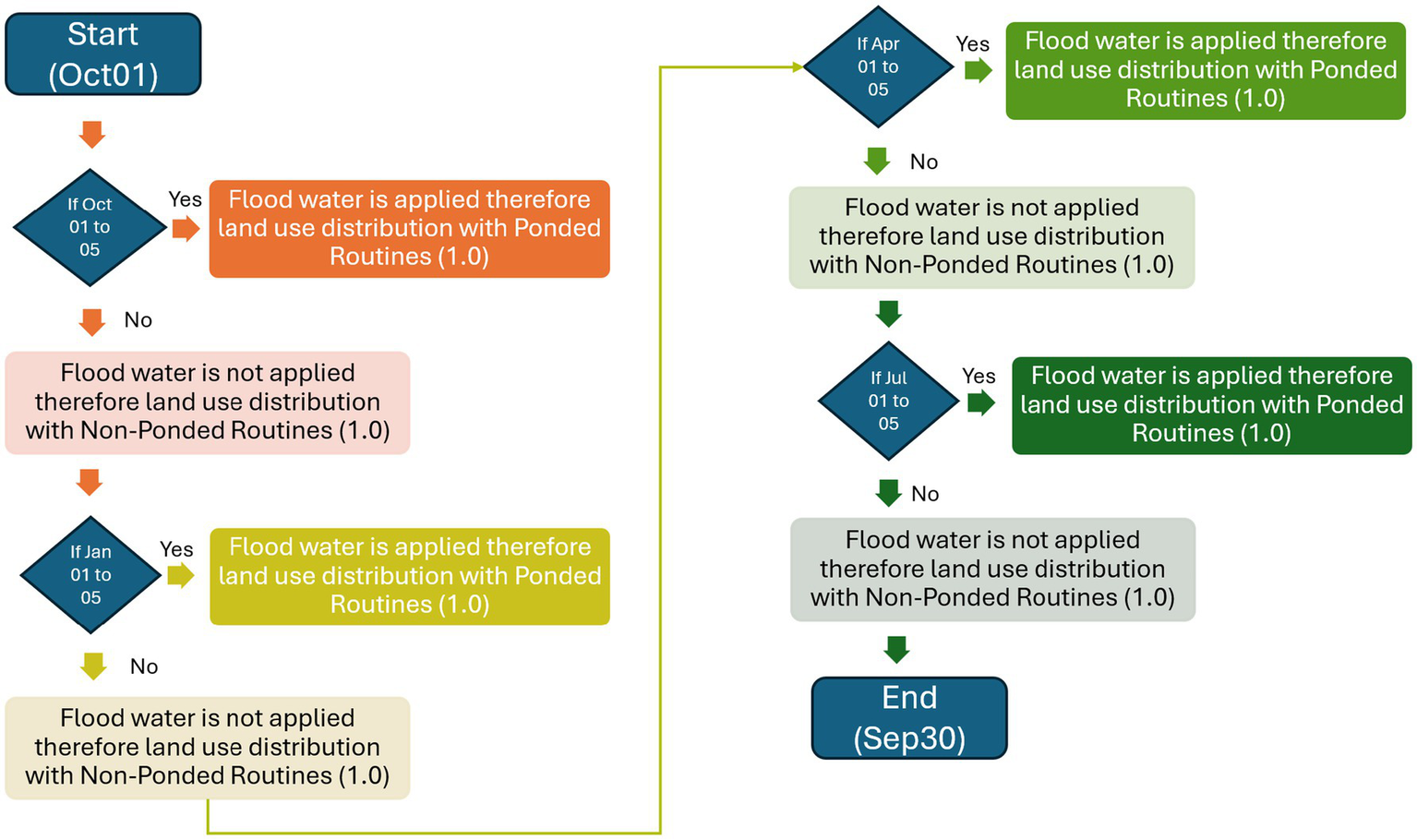 Figure 3 shows a decision chart representation of a hydrological year starting on October 01 and ending on September 30. The conceptual IDC model runs with ponded routines for five consecutive days during the fall (Oct 01–05), winter (Jan 01–05), spring (Apr 01–05), and summer (01–05) seasons when WAFR is applied. The rest of the time the model runs with non-ponded routines. Two input files are used to set up the non-ponded and ponded routines. The “Non-Ponded Crop Area” file (CropAreas.dat) contains the land use distribution of non-ponded (agricultural) crops for each element in the simulation period. Each element associated with each crop and soil type combination is active when there is a coefficient of one (1.0) and non-active when there is a coefficient of zero (0.0) during each time step in the input area file. In Figure 3 the “Non-Ponded Crop Area” file has values of one (1.0) when WAFR is not applied. The “Ponded Crop Area” file (RiceAreas.dat) contains the land distribution for crops when WAFR is applied, and agricultural fields can potentially get flooded. Ponded routines are needed here so WAFR can be ponded, and it does not become excess water or surface runoff that will be drained out of the field domain. In this file, values of one (1.0) are used for those days when WAFR is applied, and zero (0.0) when not applied. As notice, there is an overlap of both files, non-ponded and ponded crop areas, with one land use active with non-ponded routines, and then there is a shift to ponded routines for a few days allowing the applied WAFR to be ponded if needed and then shifting back to non-ponded conditions when WAFR stops adding.