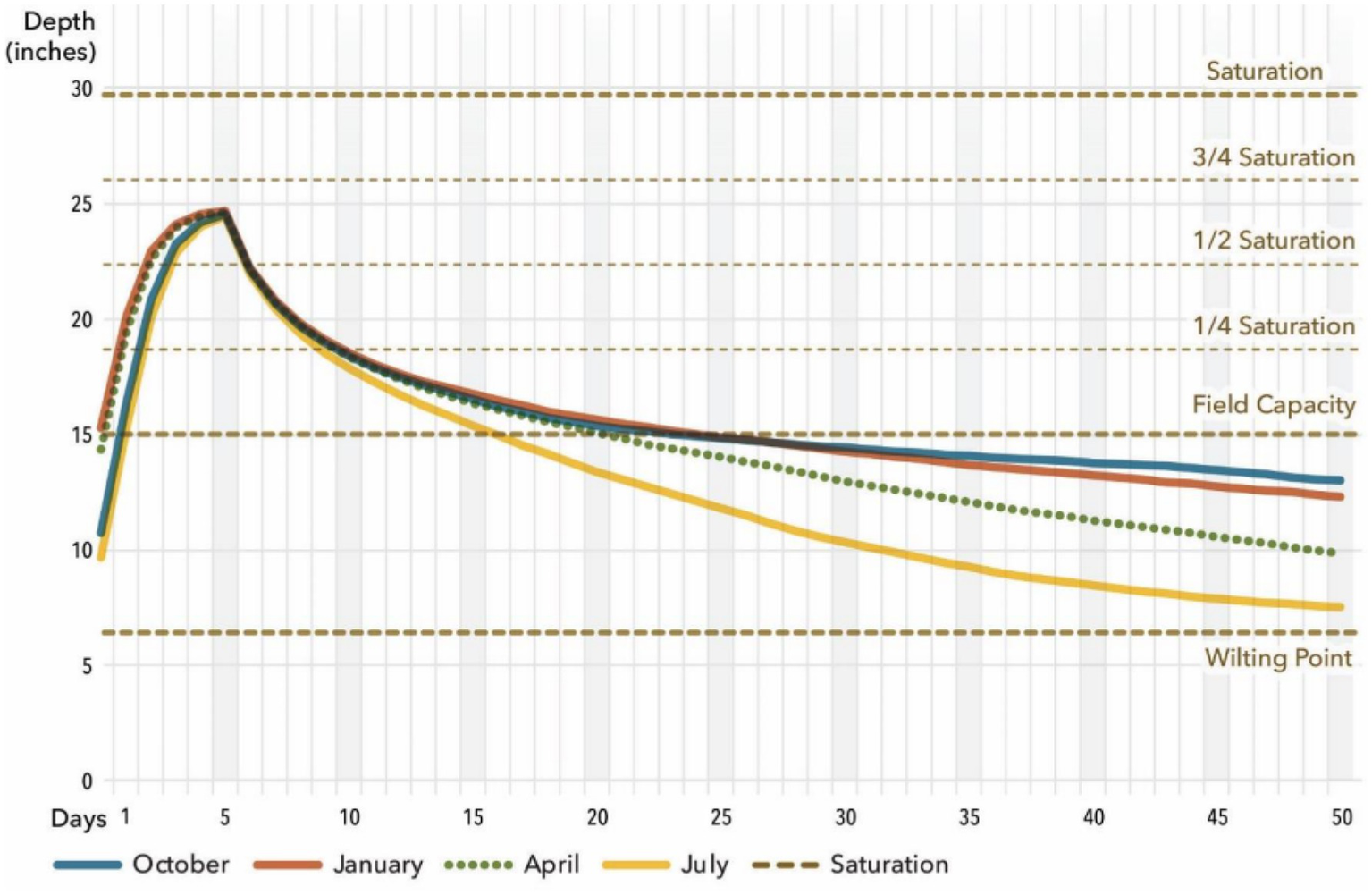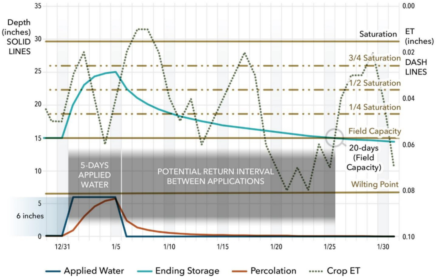 Figure 5 shows that if six inches (15.24 cm) of water depth (equivalent to five cfs or 0.142 m3/s) are applied over five consecutive days, the soil moisture content by day five is almost 3/4 saturation (equivalent to 24.7 inches or 62.7 cm) for the six feet (1.829 m) depth soil profile. At the end of day-five applied water stops. During summer (July), the ending soil moisture content takes approximately 10 days to drain down to reach the field capacity threshold (orange line). During winter (January), the ending soil moisture content takes about 20 days to drain down to reach the field capacity threshold (red line). Spring and fall season intervals are between summer and winter. This interval between when the applied water stops and when the ending soil moisture content reaches field capacity threshold is the potential return interval between applications (see Figure 4).