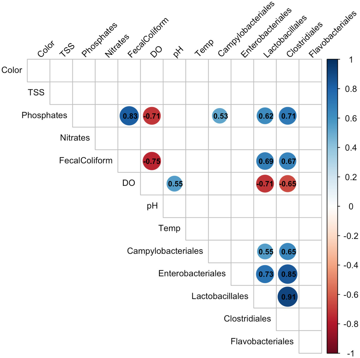 Figure 5. Spearman correlations between physicochemical parameters and top bacterial groups. Significant correlations (p < 0.05) are shown as colored circles with negative (red) or positive (blue) correlation. Insignificant correlations are not shown.