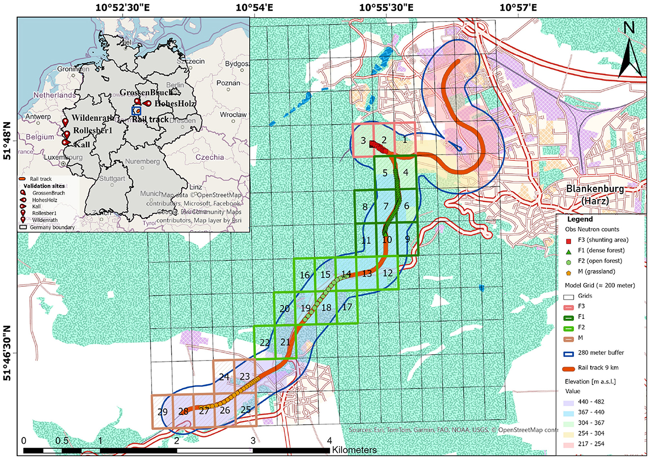 We make use of rail-based CRNS data published by Altdorff et al. (2023) along a ~ 9 km long railway segment between Blankenburg-Rübeland, Germany (Figure 1). Observational rail-based CRNS data were collected using a novel mobile CRNS system installed in the locomotive of a cargo train designed for continuous automated CRNS measurements. This system covers a segment of the railway and provides hectare-scale neutron counts, revealing spatial soil moisture patterns on a medium scale. The datasets were recorded from September 2021 to July 2022. The elevation of the area ranges from 217 to 482 meters (asl). The experimental railway track crosses four different types of land cover: dense and open forest, semi-natural areas, and meadows. The main texture of the soil is silty loam soil, which has been extensively studied by Yang et al. (2018); Winter et al. (2021). During the period 1999 to 2019, Blankenburg recorded an average annual temperature of °C and an average annual precipitation of 760 mm (Altdorff et al., 2023). For a more detailed analysis of the climatic characteristics of the Rübeland region, (see Wollschläger et al., 2017). Furthermore, the red pins on the German map mark the locations of the cross-validation sites: Grosses Bruch, Hohes Holz, Kall, Rollesbroich, and Wildenrath. These sites, which have been extensively discussed in Bogena et al. (2022), Li et al. (2024), Baatz et al. (2017), Baatz et al. (2014), and Bogena et al. (2018), are utilized here for cross-validation purposes.
