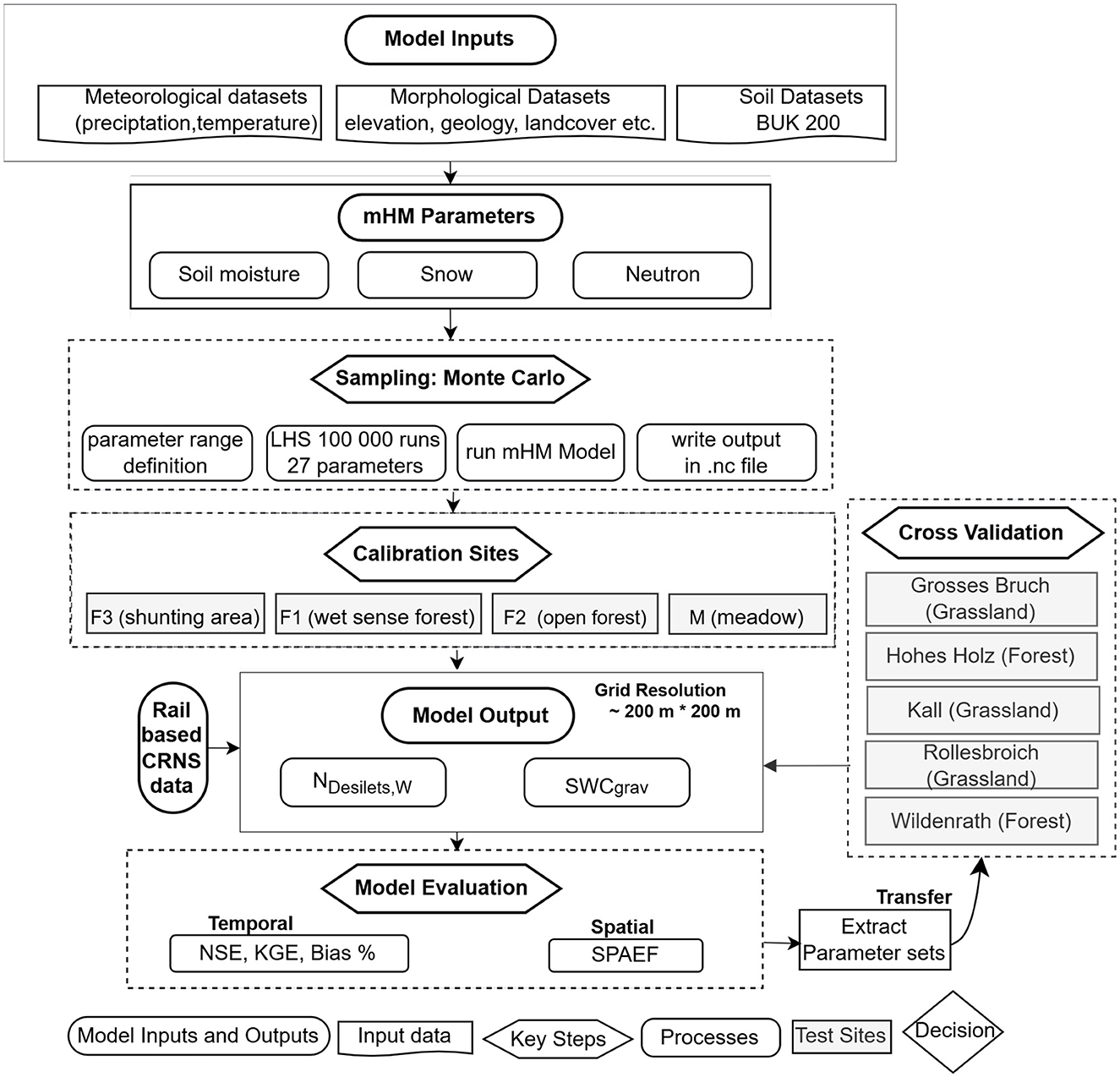 Figure 2 presents the flow diagram of our study; we used mHM to simulate SWC in various types of land cover. The model requires multiple input datasets, including meteorological data (precipitation and temperature), morphological datasets (elevation, geology, and land cover), and soil datasets (BUEK200); the data source is given in Table 1. These datasets serve as primary inputs to define the hydrological conditions in the study area. The model parameters focus on key hydrological variables, specifically snow, soil moisture, and neutron count dynamics, which are essential to simulate water balance dynamics. For the comparison of soil moisture patterns from CRNS and mHM, we use the gravimetric soil moisture product from CRNS, and convert the modeled SWC to gravimetric soil moisture using θgrv = SWC/ϱb, where ϱb is the dry soil bulk density.