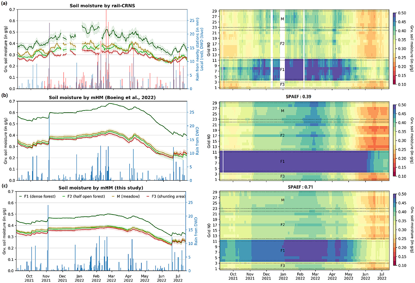 Figure 3. Comparison of soil moisture estimates from different methods across various land cover types. (a) Soil moisture measurement using rail-based cosmic-ray neutron sensing (rail-CRNS). (b) Soil moisture was simulated using mHM from Boeing et al. (2022) used in the GDM. (c) Soil moisture was simulated using mHM in this study. The left panels show a time series of soil moisture (g/g) for different land cover types (F1- dense forest, F2- half-open forest, F3- shunting area, M- meadow), along with precipitation data. The right panels display the spatial distribution of soil moisture over time from Oct 2021 to July 2022 for different grid locations.