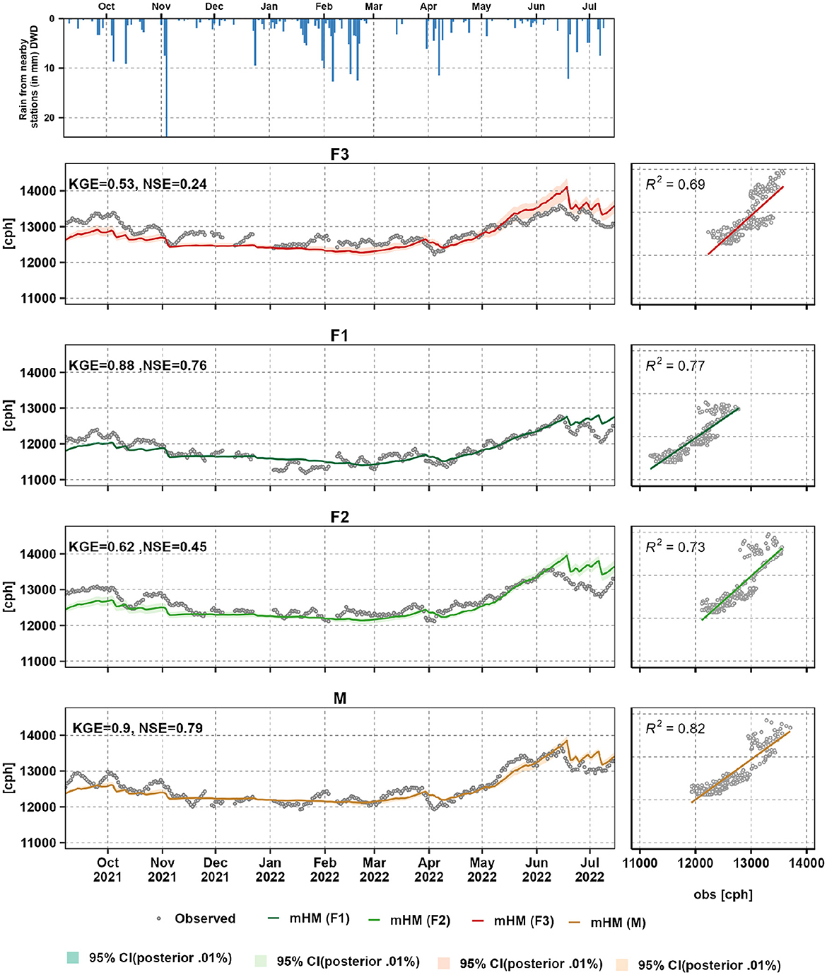 Figure 4. Neutron counts simulated by mHM at four land cover sites (M: meadow, F2: open forest, F1: dense forest, and F3: shunting area) between Blankenburg and Rübeland. Measured rail-based CRNS data are shown as gray dots, and an overlay shows daily precipitation (blue bars) from September 2021 to July 2022.