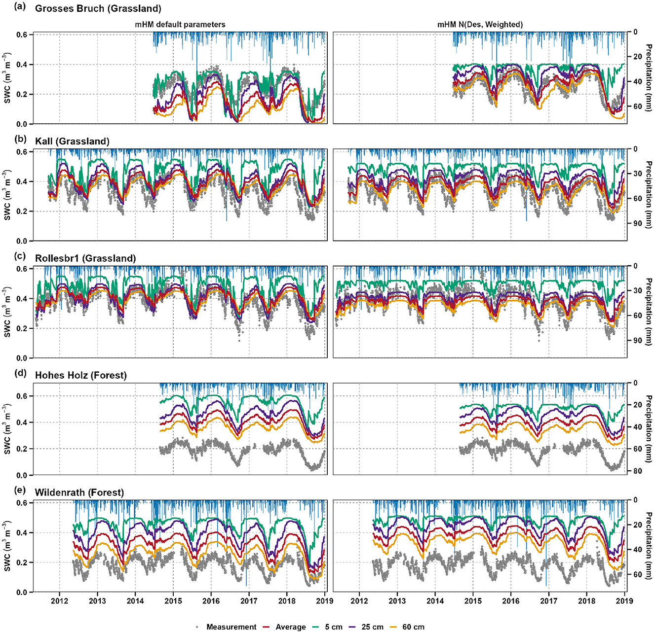 Figure 5. Comparison of soil moisture (SWC) simulations using mHM at three grassland sites (a) Grosses Bruch, (b) Kall, (c) Rollesbroich, and two forest sites (d) Hohes Holz, (e) Wildenrath. The left panel represents the mHM default simulation with parameters from Boeing et al. (2022), while the right panel shows the calibrated simulation using the NDes,W method. Soil moisture is shown for different depths: 5 cm (green), 25 cm (blue), and 60 cm (orange), along with the average soil moisture (red). Observed CRNS soil moisture measurements are represented by gray dots.