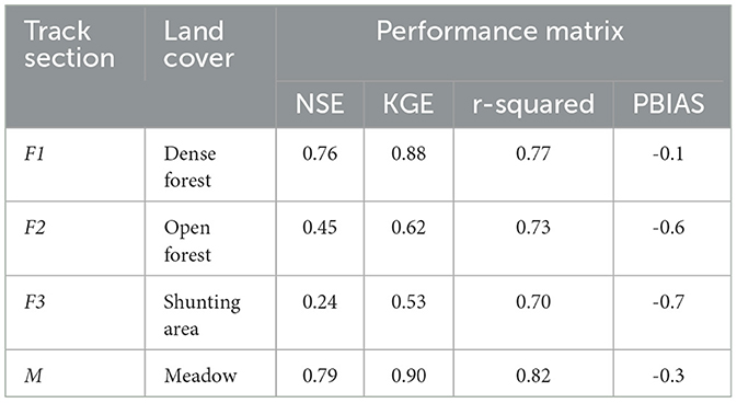 One of the main challenges identified in this study is the resolution mismatch between mHM and observed CRNS data. Although mHM operates at a grid resolution of ~ 200 m that is comparable with the CRNS footprint, the detection mechanism of neutrons is non-linearly sensitive to the near field, e.g., to soil moisture in the nearest ~30 m around the rail track (Schrön et al., 2023). This discrepancy affects the performance of the model in heterogeneous landscapes where the land cover changes more granularly around the rail track, so that the single land cover characteristic assigned to the larger model grid loses representativeness.